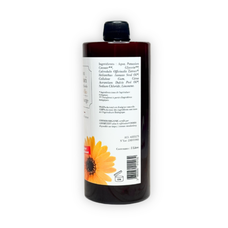 Ingrédients : AQUA, POTASSIUM COCOATE**, GLYCERIN**, CALENDULA OFFICINALIS EXTRACT*, HELIANTHUS ANNUUS SEED OIL*, CELLULOSE GUM, CITRUS AURANTIUM DULCIS PEEL OIL*, SODIUM CHLORIDE, LIMONENE.