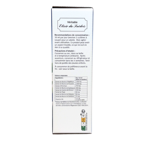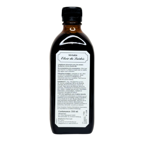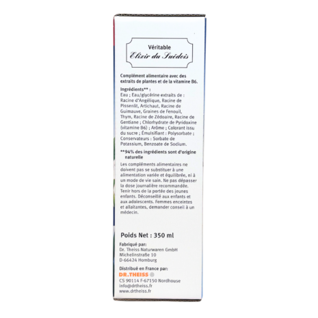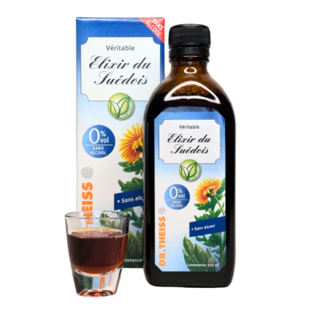 L’Élixir du Suédois sans alcool est une version moderne et plus douce de la célèbre recette traditionnelle. Formulé à base de plantes soigneusement sélectionnées et enrichi en vitamine B6, il offre une alternative pratique et accessible, idéale pour un usage quotidien sans compromis sur l’efficacité.